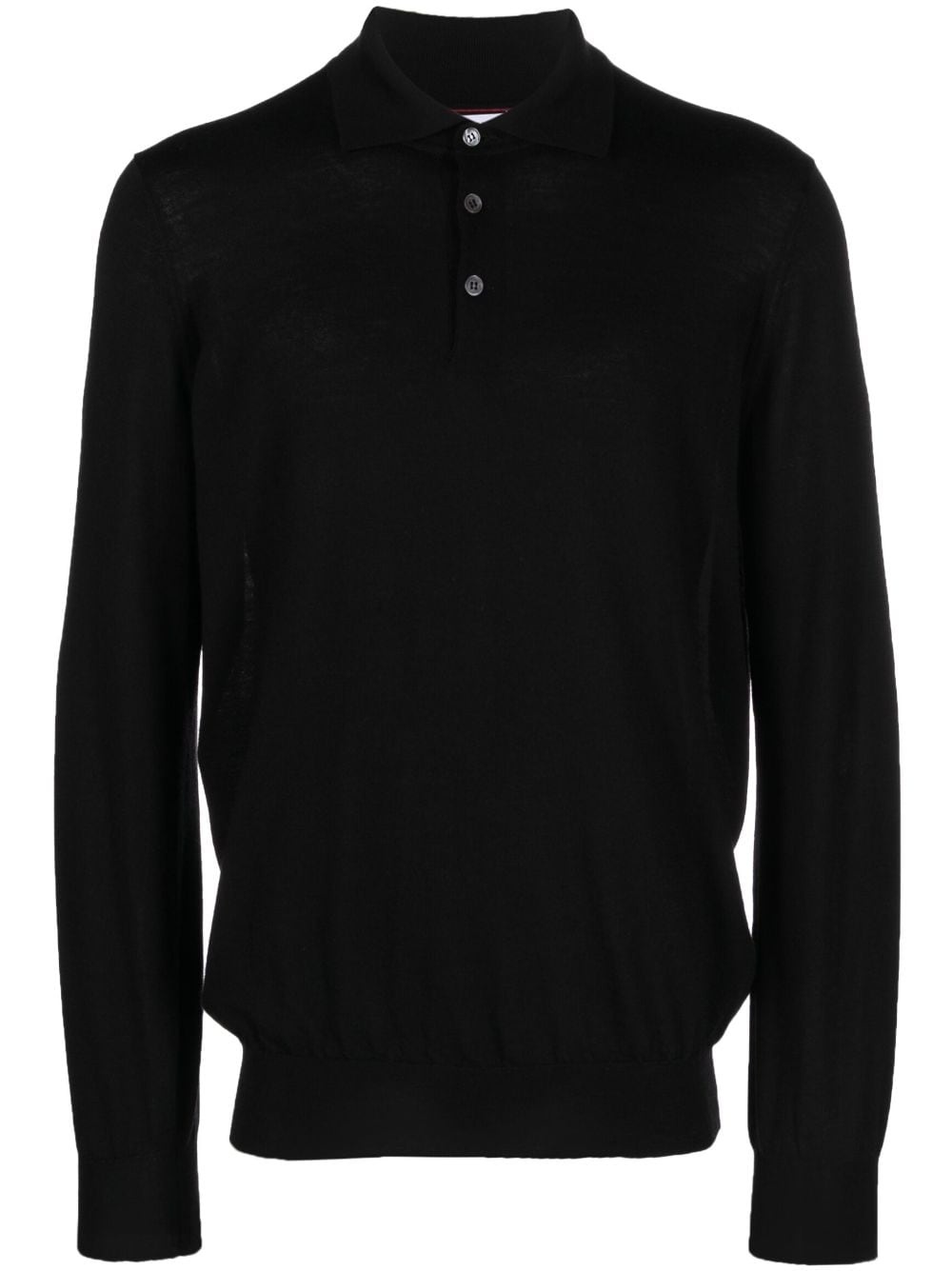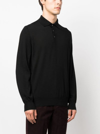 long-sleeve virgin wool polo shirt Highlights - Jet black - Virgin wool-cashmere blend - Polo collar - Front button placket - Long sleeves - Ribbed cuffs and hem Made in Italy Composition Virgin Wool 90%, Cashmere 10% SIZE & FIT Model measurements Height 6 ft 1 in(1.86 m) Bust/Chest 37.4 in(95 cm) Hips 34.64 in(88 cm) Waist 29.13 in(74 cm) Measurement CHEST 42.51 in(108 cm) FittingInformation Designed for a relaxed fit, this polo shirt offers comfort and movement Made from a midweight non-stretch fabric, this piece offers minimal elasticity when worn This piece fits true to size – take your usual size Washing instructions Hand Wash