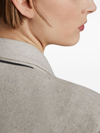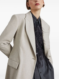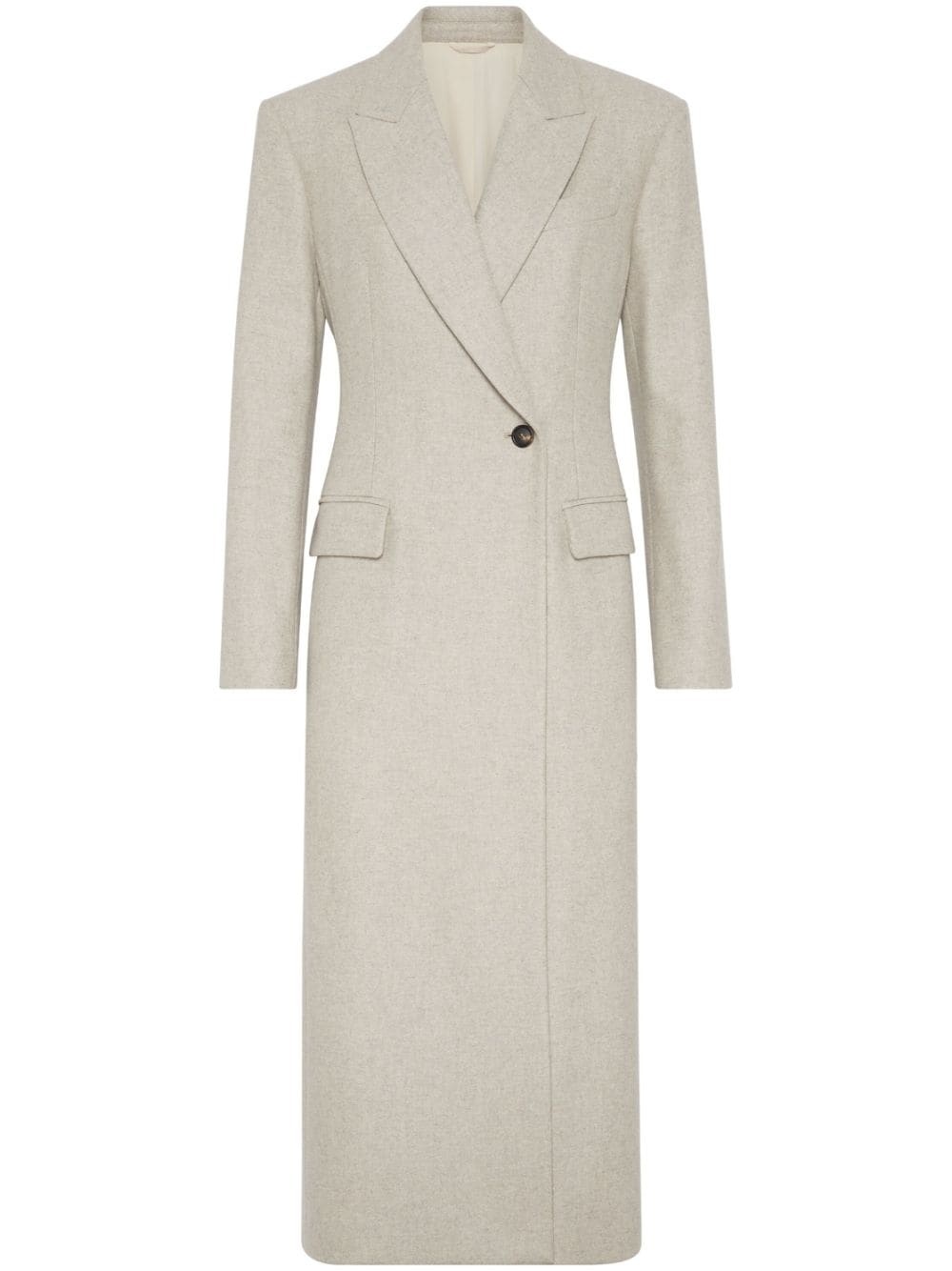 long wool coat Highlights - Ecru - Wool - Melange effect - Peak lapels - Signature monili chain detail - Shoulder pads - Long sleeves with buttoned cuffs - Chest welt pocket - Two front flap pockets - Rear slit - Straight hem - Long length - Double-breasted button fastening Made in Italy Composition Wool 98%, Other fibres 2%