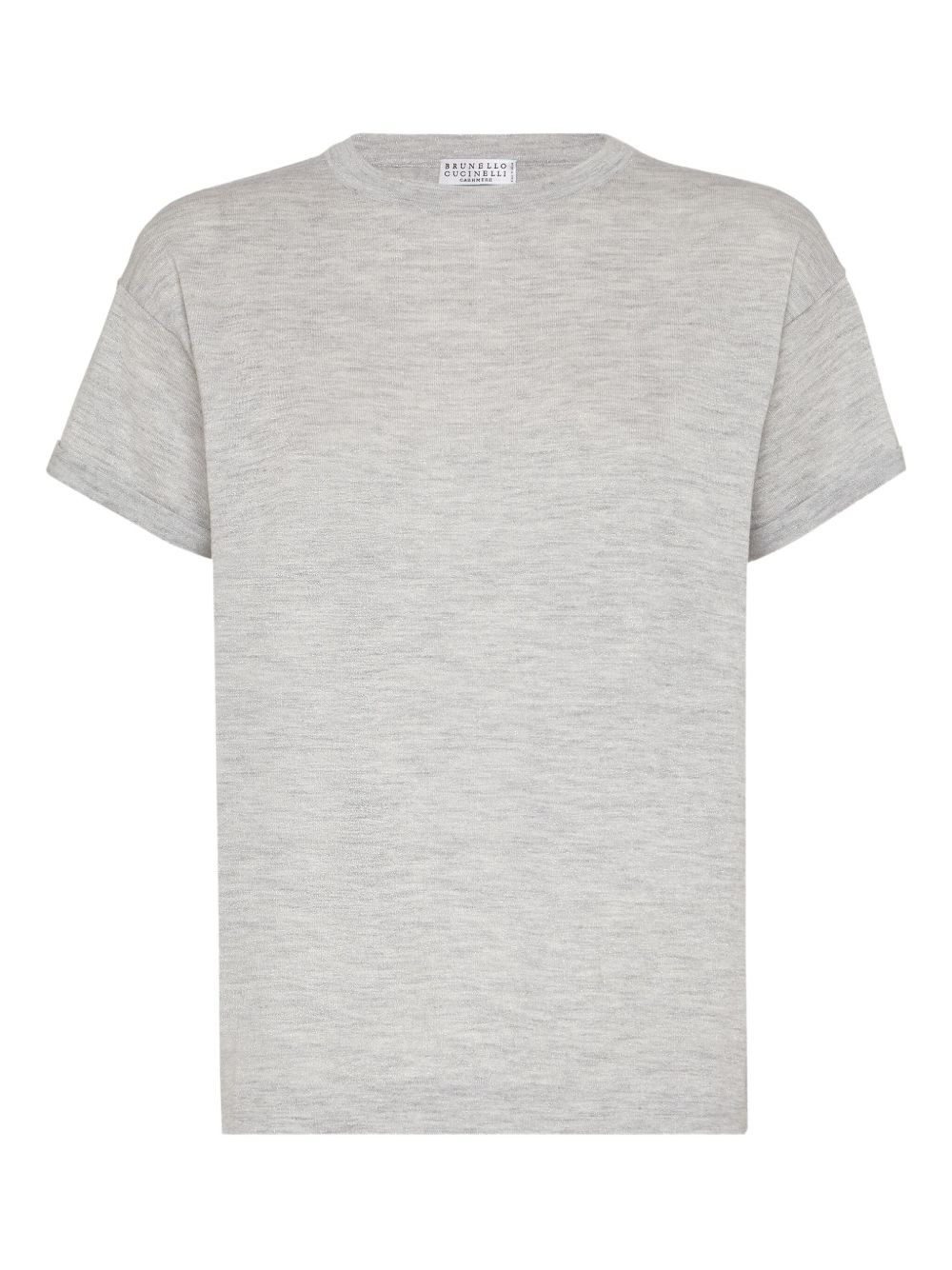 lurex-knit T-shirt Highlights - Grey - Cashmere-silk blend - Round neck - Short sleeves - Turn-up cuffs - Straight hem Made in Italy Composition Cashmere 51%, Silk 22%, Nylon 20%, Polyester 7% SIZE & FIT FittingInformation This piece fits true to size. We recommend you get your regular size Cut for a relaxed fit Made with a mid-weight fabric Washing instructions Hand Wash
