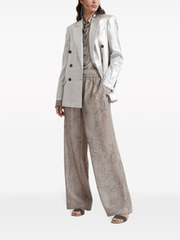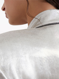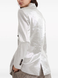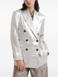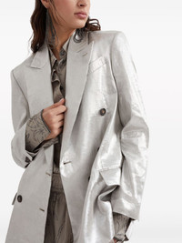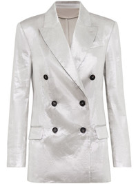 metallic double-breasted blazer Highlights - Grey - Metallic finish - Linen blend - Peak lapels - Chest welt pocket - Long sleeves - Buttoned cuffs - Double-breasted button fastening - Two front flap pockets - American rear vent - Straight hem Made in Italy Composition Linen/Flax 88%, Polyester 12% SIZE & FIT Measurement SLEEVE LENGTH 23.62 in(60 cm) HIPS 41.33 in(105 cm) LENGTH 28.34 in(72 cm) WAIST 36.22 in(92 cm) Washing instructions Read Manufacturer Guidelines