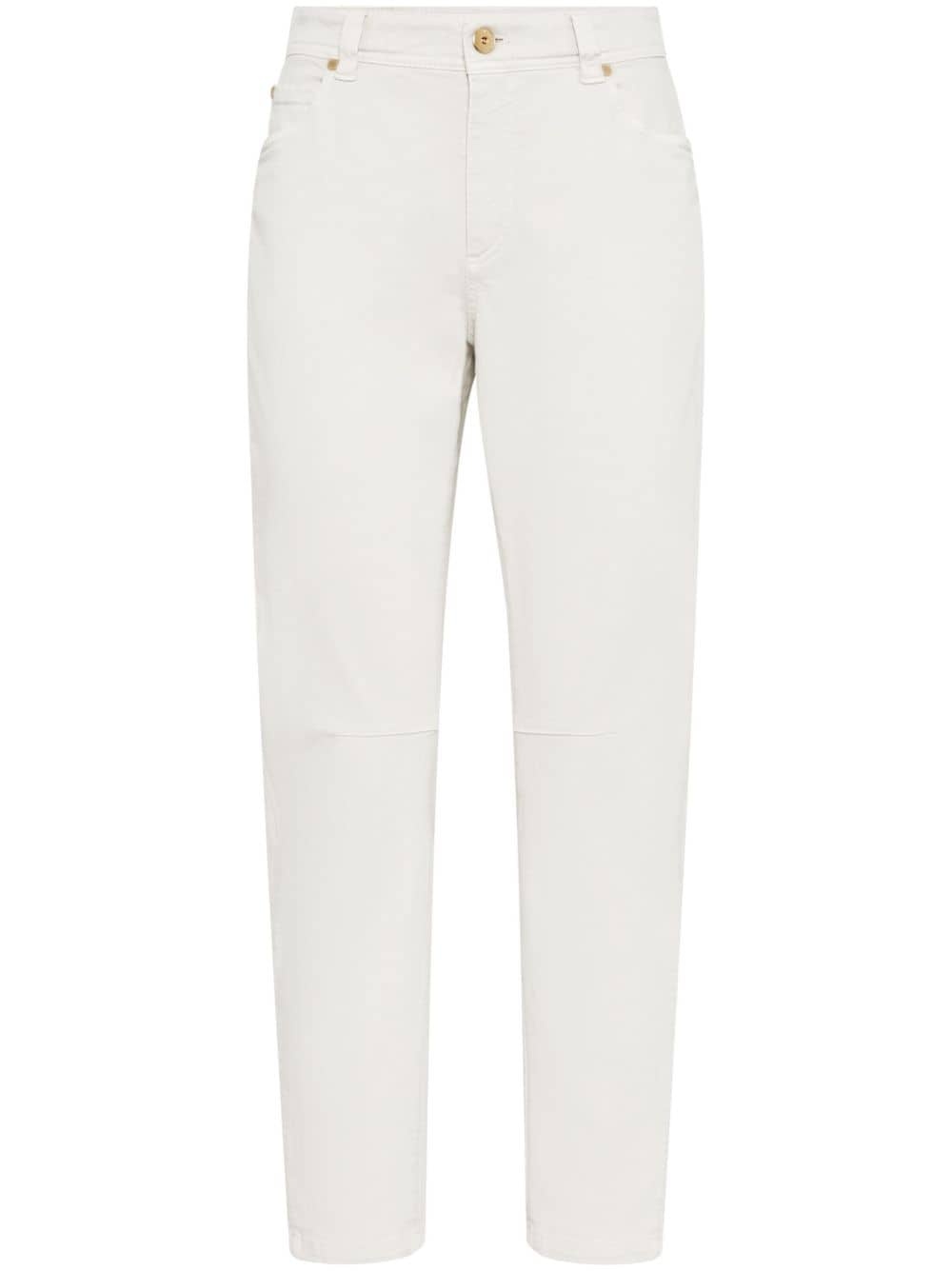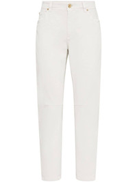 mid-rise tapered-leg jeans Highlights - Light beige - Stretch-cotton - Signature monili chain detail - Logo patch to the rear - Tapered leg - Belt loops - Mid-rise - Concealed fly and button fastening - Classic five pockets - Ankle-length Made in Italy Composition Cotton 96%, Elastane 4%
