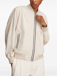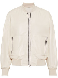 Monili bead-embellished leather jacket Brunello Cucinelli’s jacket is modelled on classic bomber jackets. It’s crafted from chalk-white leather and decorated with a signature Monili embellishment – an adornment comprising faceted brass beads. Highlights - Chalk white - Leather - Signature monili chain detail - Ribbed band collar - Front two-way zip fastening - Long sleeves - Ribbed cuffs and hem - Two side zip-fastening pockets - Straight hem Made In Italy Composition Leather 100% Washing instructions Specialist Cleaning