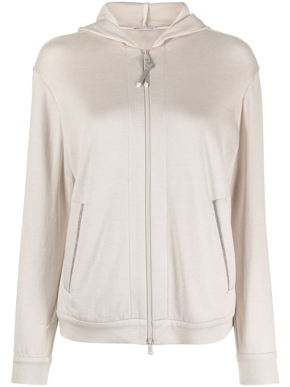 Monili bead-embellished zip hoodie This beige hoodie hails from Brunello Cucinelli’s Travelwear line – a capsule of casual pieces ‘dedicated to moments of relaxation and free time.’ It’s blended with cotton and silk threads then embellished with Monili beads at the welt pockets and zip pull. Highlights - Sand beige - Cotton-silk blend - Soft jersey - Signature monili chain detail - Slouchy hood - Front two-way zip fastening - Long sleeves - Two front welt pockets Made in Italy Composition Cotton 67%, Silk 31%, Polyamide 2% SIZE & FIT Model measurements Height 5 ft 10 in(1.78 m) Bust/Chest 31.49 in(80 cm) Hips 35.03 in(89 cm) Waist 23.62 in(60 cm) FittingInformation Designed for a relaxed fit, this piece allows for comfort and movement when worn This piece fits true to size – take your usual size