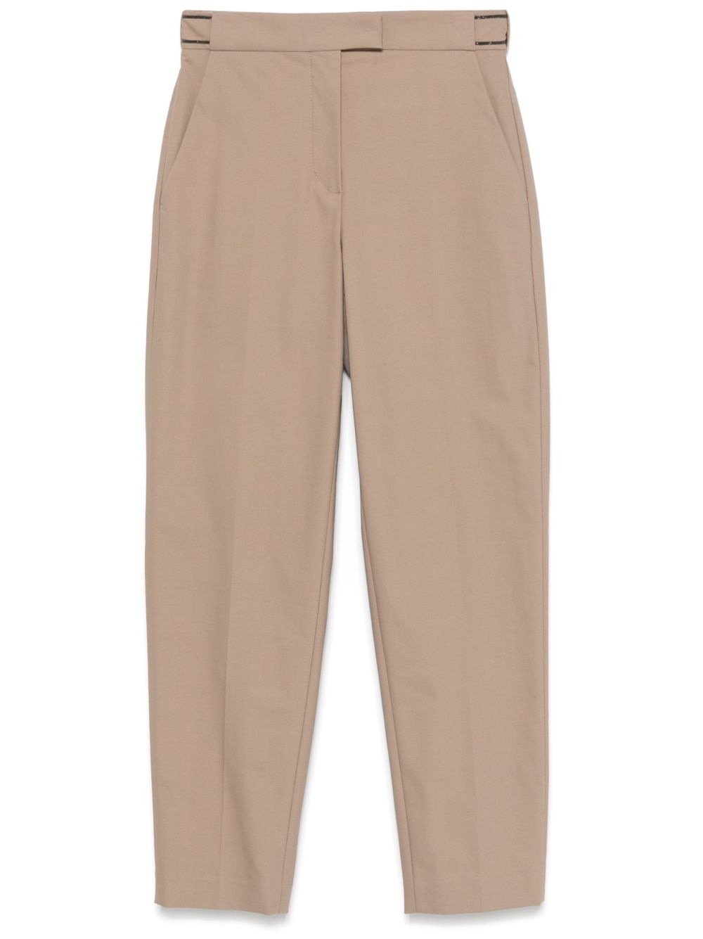 Monili chain-detail trousers Highlights - Light brown - Concealed front button, hook and zip fastening - Two diagonal pockets to the sides - Two rear welt pockets - Tapered leg Made in Italy Composition Lining: Acetate 65%, Polyester 35% Outer: Cotton 97%, Elastane 3% SIZE & FIT Model measurements Height 5 ft 10 in(1.78 m) Bust/Chest 33.85 in(86 cm) Hips 36.61 in(93 cm) Waist 26.77 in(68 cm) FittingInformation Designed for a slim fit, these trousers offer a close fit at the waist, allowing a comfortable close fit and some movement over the leg Made from a midweight stretch fabric, this piece offers elasticity and flexibility when worn Washing instructions Dry Clean Only