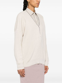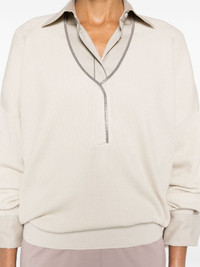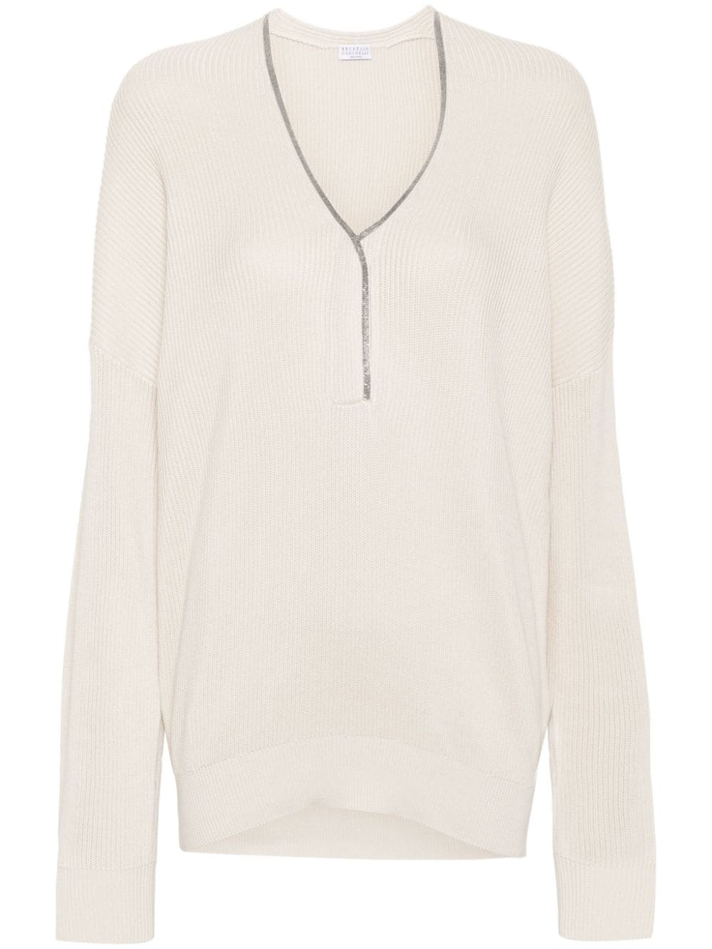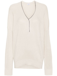 Monili-chain ribbed jumper Highlights - Light beige - Cotton - Ribbed knit - Signature monili chain detail - V-neck - Drop shoulder - Long sleeves - Ribbed cuffs and hem Made in Italy Composition Brass 100%, Cotton 100% SIZE & FIT Model measurements Height 5 ft 10 in(1.78 m) Bust/Chest 33.07 in(84 cm) Hips 36.61 in(93 cm) Waist 24.8 in(63 cm) FittingInformation Designed for a relaxed fit, this piece allows for comfort and movement when worn The ribbed hem offers a close, comfortable fit Made with a midweight knit, this piece offers some stretch This piece fits true to size – take your usual size
