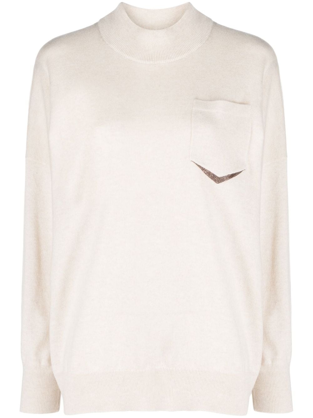Monili-detail cashmere jumper Highlights - Light beige - Cashmere - Knitted construction - Signature monili chain detail - Mock neck - Long sleeves - Chest patch pocket - Ribbed cuffs and hem Made in Italy Composition Cashmere 100% SIZE & FIT Model measurements Height 5 ft 10 in(1.79 m) Bust/Chest 31.1 in(79 cm) Hips 35.03 in(89 cm) Waist 24.01 in(61 cm) FittingInformation Designed to be unstructured, offering a loose fit throughout Made with a midweight knit, this piece offers some stretch This piece fits true to size – take your usual size Washing instructions Hand Wash
