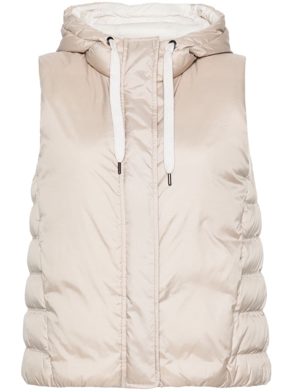 Monili-detail padded gilet Highlights - Medium beige - Feather down - Padded design - Quilted panels - Signature monili chain detail - Drawstring hood - Sleeveless - Two press-stud fastening side pockets - Straight hem - Front press-stud and zip fastening Made in Italy Composition Lining: Nylon 100%, Polyamide 100%, Feather Down 100% Outer: Polyester 100% SIZE & FIT Model measurements Height 5 ft 11 in(1.8 m) Bust/Chest 31.49 in(80 cm) Hips 36.61 in(93 cm) Waist 24.4 in(62 cm) FittingInformation Designed for a relaxed fit, this piece allows for comfort and movement when worn The elasticated hem allows for movement and a comfortable fit Made from a padded non-stretch fabric, giving it no natural elasticity This piece fits true to size – take your usual size