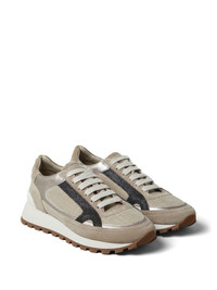 Monili-embellished panelled sneakers Drawing inspiration from activewear, these Brunello Cucinelli sneakers are crafted in the Italian hamlet of Solomeo to a chunky silhouette defined by the textural contrast of its suede and virgin wool construction. Complementing the tactile quality, signature Monili beading adorns the sides, lending sparkling dimension. Highlights - Light brown - Suede/virgin wool - Signature monili chain detail - Branded heel counter - Panelled design - Round toe - Front lace-up fastening - Branded insole - Chunky rubber sole Made in Italy Composition Leather 100% SIZE & FIT Measurement HEEL 1.25 in(3.2 cm)