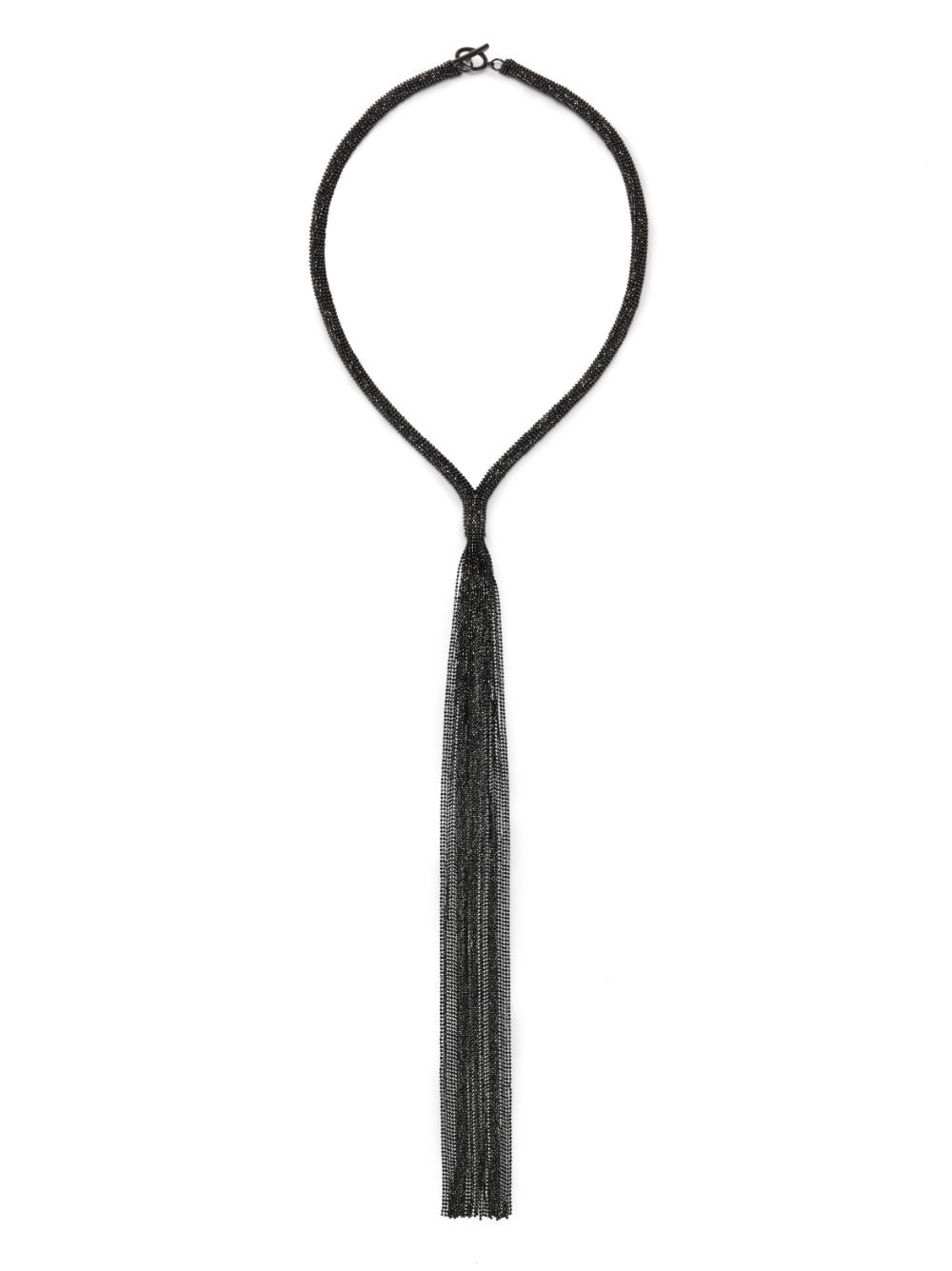 Monili tie necklace Highlights - Black - Brass - Bead embellishment - Large tassel detail - T-bar fastening Made in Italy SIZE & FIT Measurement Length when open 21.25 in(54 cm)