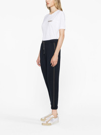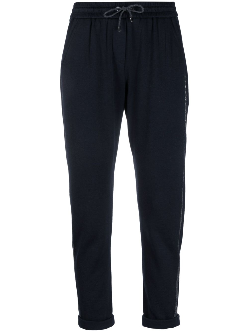 Monili-trimmed cropped track pants Woven in Italy from a delicate blend of cotton and silk, these midnight blue track pants are cut to a relaxed fit and fall to a tapered cropped leg. The pairs sportswear-inspired silhouette is elevated with the house's signature multifaceted chain-link Monili trim at the sides. Highlights - Midnight blue - Cotton-silk blend - High-waisted - Elasticated drawstring waistband - Two side slit pockets - Tapered leg - Cropped - Turn-up cuffs - Signature monili chain detail Made in Italy Composition Outer: Eco Brass 100%, Cotton 67%, Silk 31%, Polyamide 2% Lining: Acetate 74%, Silk 26% SIZE & FIT Model measurements Height 5 ft 9 in(1.75 m) Bust/Chest 31.49 in(80 cm) Hips 34.05 in(86.5 cm) Waist 24.21 in(61.5 cm) FittingInformation Designed for a slim fit, these trousers offer a close fit at the waist, allowing a comfortable close fit and some movement over the leg The elasticated waist allows for a comfortable fit Made from a midweight stretch fabric, this piece offers elasticity and flexibility when worn This piece fits true to size – take your usual size