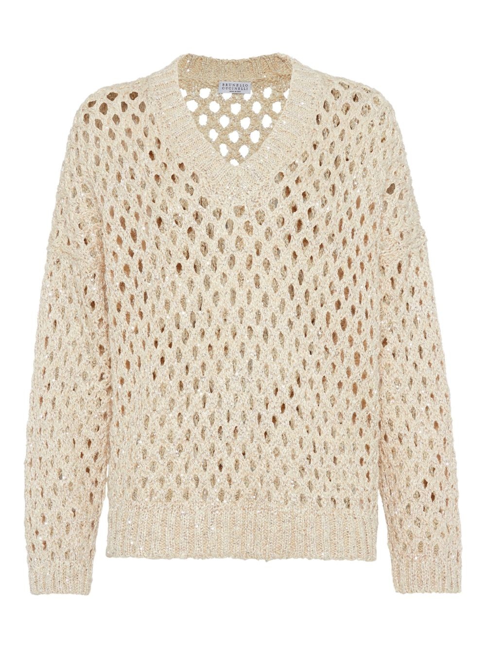 open-knit jumper Highlights - Light beige - V-neck - Drop shoulder - Long sleeves - Ribbed trim Made in Italy Composition Silk 36%, Eco Linen 34%, Fabric 30%