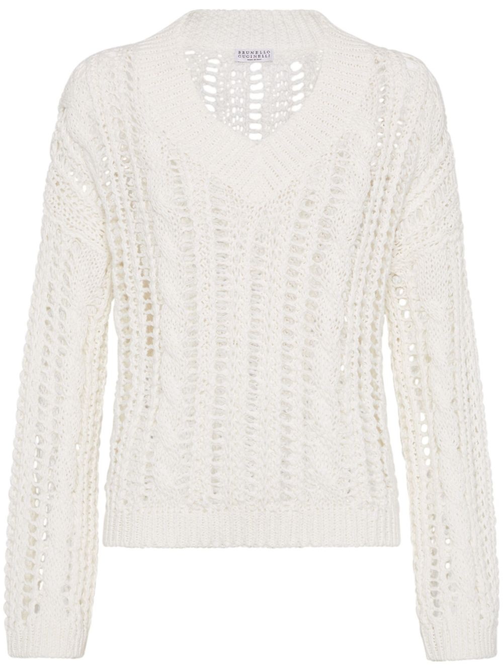 open-knit sweater Highlights - White - Ribbed cuffs and hem - Ribbed v-neck - Drop shoulder Made in Italy Composition Jute 55%, Cotton 45% Washing instructions Read Manufacturer Guidelines