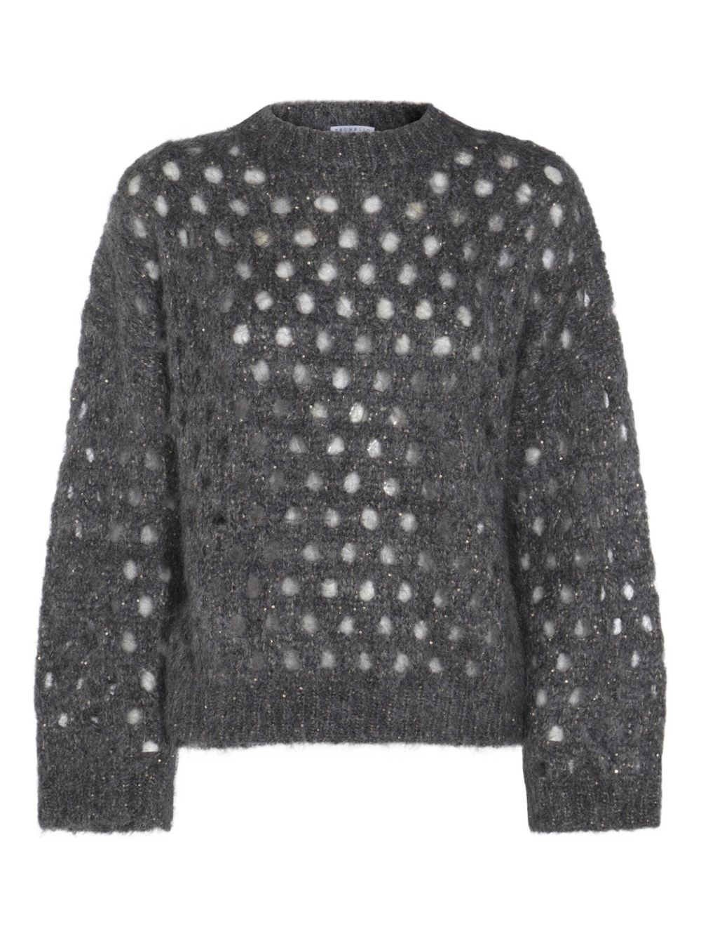 open-knit sweater Highlights - Dark grey - Open knit - Crew neckline - Long sleeves - Ribbed cuffs and hem Made in Italy Composition Mohair 54%, Polyamide 26%, Polyester 15%, Wool 5%