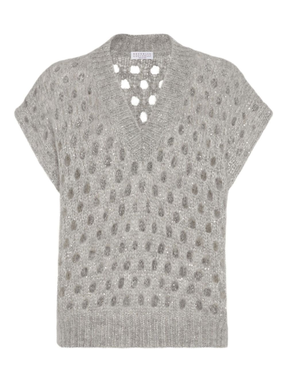open-knit sweater Highlights - Light grey - V-neckline - Open knit - Sleeveless - Ribbed hem Made in Italy Composition Mohair 54%, Polyamide 26%, Polyester 15%, Wool 5% Washing instructions Hand Wash