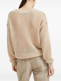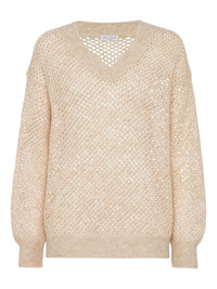 open-knit sweater Highlights - Light beige - V-neck - Drop shoulder - Long sleeves - Ribbed trim Made in Italy Composition Mohair 42%, Nylon 30%, Fabric 28% Washing instructions Hand Wash