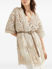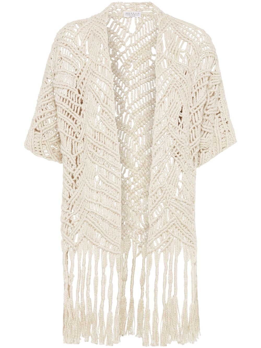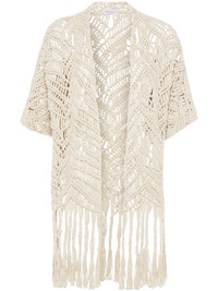 Opera macrame cardigan Highlights - Light beige - Open front - Short sleeves - Fringed edge Made in Italy Composition Silk 52%, Eco Linen 48% Washing instructions Specialist Cleaning