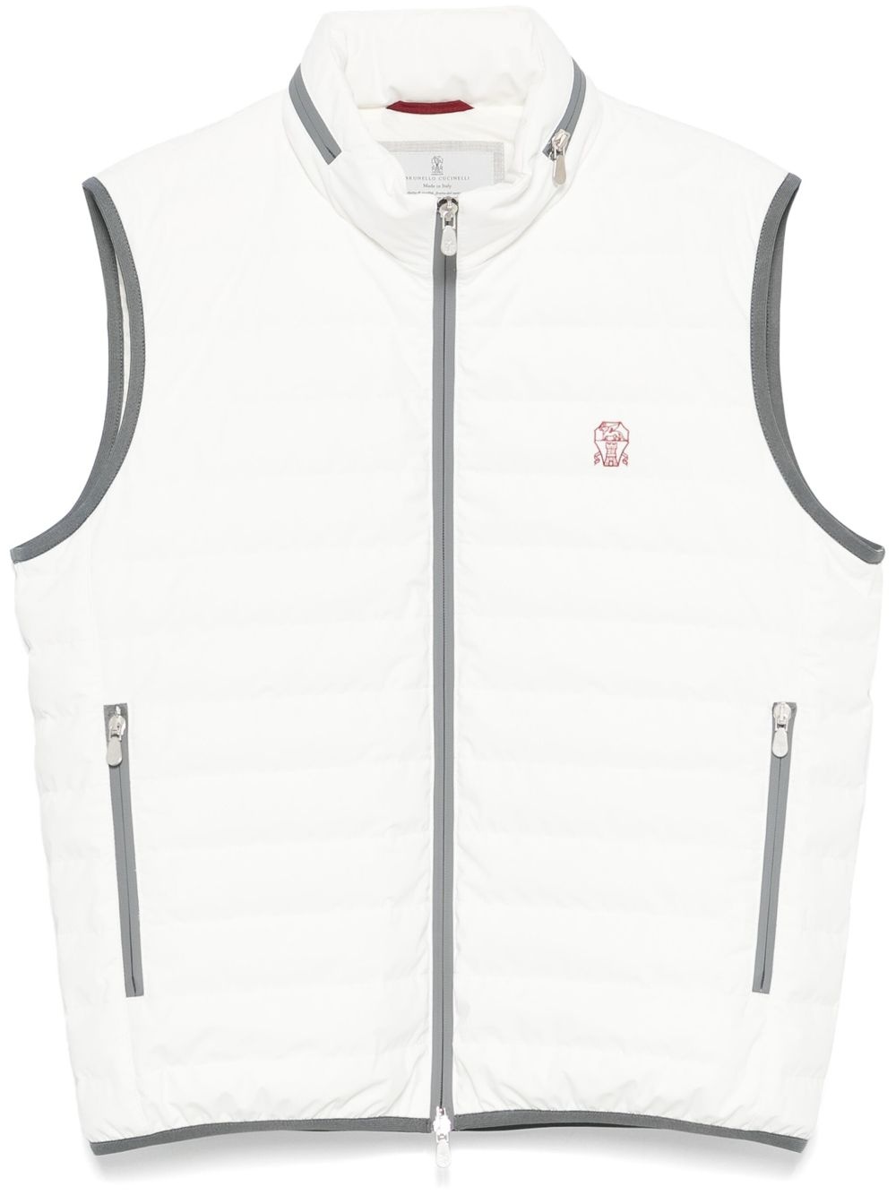 padded gilet Highlights - Ecru - Front zip fastening - Concealed hood - Sleeveless - Two side zip-fastening pockets Made in Italy Composition Outer: Polyamide 83%, Elastane 17% Lining: Nylon 100%, Goose Down 90%, Polyamide 88%, Elastane 12%, Goose Feather 10% SIZE & FIT Model measurements Height 6 ft 2 in(1.87 m) Bust/Chest 36.41 in(92.5 cm) Hips 37 in(94 cm) Waist 29.52 in(75 cm) FittingInformation Designed for a regular fit, allowing for a comfortably loose fit throughout the body The elasticated hem allows for movement and a comfortable fit Made from a padded stretch fabric, giving it elasticity and a flexible fit Washing instructions Dry Clean Only