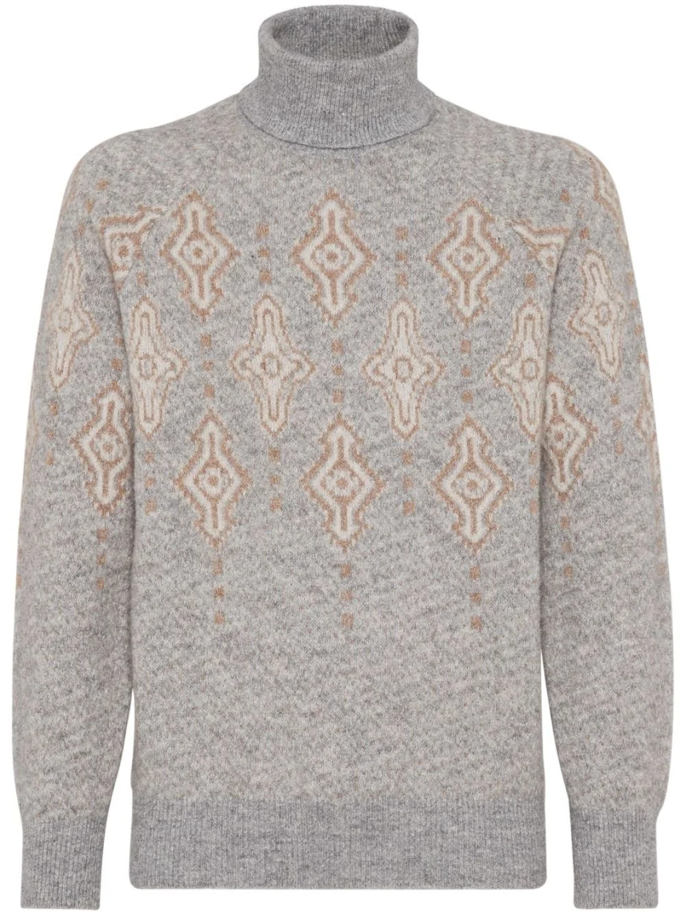 patterned-intarsia roll-neck jumper Highlights - Heather grey/multicolour - Patterned intarsia knit - Ribbed-knit edge - Melange effect - Brushed effect - Roll neck - Long raglan sleeves - Straight hem Made in Italy Composition Alpaca 37%, Cotton 30%, Polyamide 26%, Wool 7%