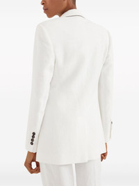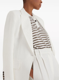 peak-lapels single-breasted blazer Highlights - Light beige - Silver-tone trim - Signature monili chain detail - Peak lapels - Front button fastening - Two front flap pockets - Shoulder pads - Long sleeves - Buttoned cuffs - Curved hem Made in Italy Composition Viscose 73%, Linen/Flax 27% Washing instructions Read Manufacturer Guidelines