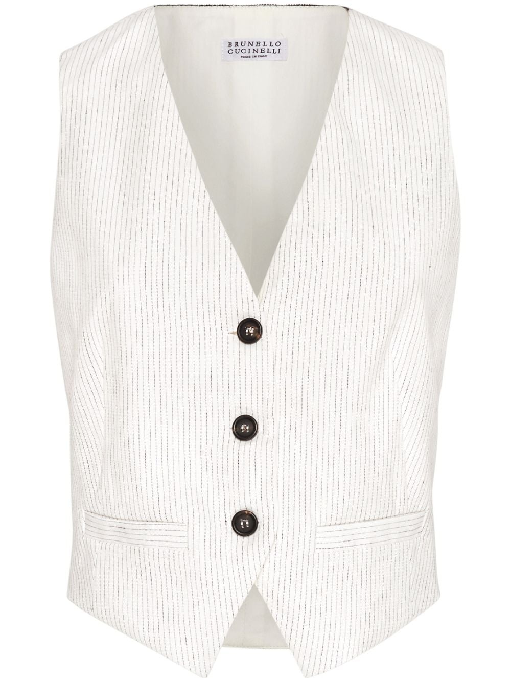 pinstripe-pattern waistcoat Highlights - White - Cotton-linen blend - Sleeveless - Front button fastening - Two front welt pockets - Straight hem Made in Italy Composition Linen/Flax 54%, Cotton 45%, Elastane 1% Washing instructions Read Manufacturer Guidelines