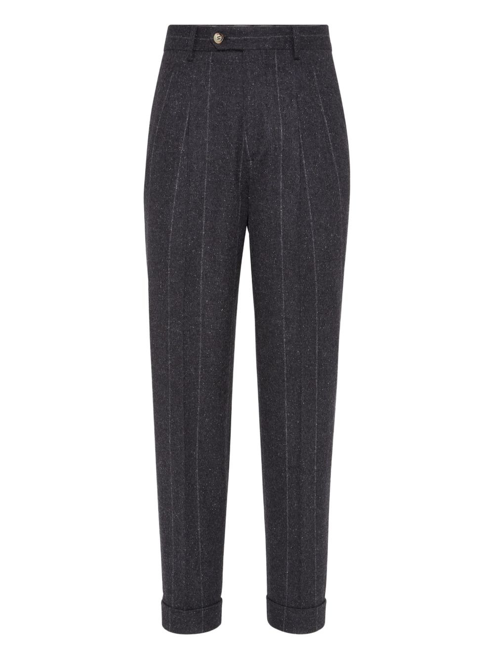 pinstripe pleated trousers Highlights - Charcoal grey - Pinstripe pattern - Pleat detailing - Cuffed hems - Off-centre button fastening Made in Italy Composition Silk 51%, Wool 47%, Cashmere 2% Washing instructions Read Manufacturer Guidelines
