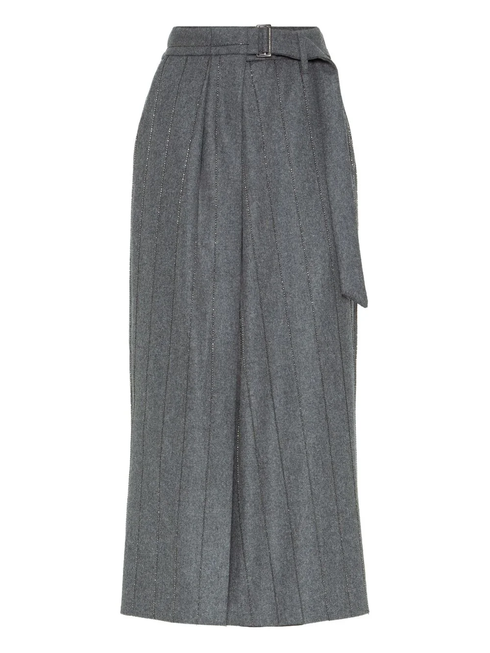Virgin wool flannel sartorial wrap skirt with shiny Chalk Stripe embroidery