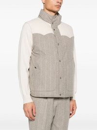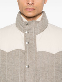 pinstriped gilet Highlights - Beige/light brown - Wool-cashmere blend - Flannel - Pinstripe pattern - Padded design - Front press-stud and zip fastening - High neck - Panelled design - Sleeveless - Two side stud-fastening pockets - Quilted lining - Curved hem Made in Italy Composition Outer: Wool 95%, Cotton 75%, Polyamide 25%, Cashmere 5% Lining: Polyamide 100%, Polyester 100%, Nylon 100%, Goose Down 90%, Goose Feather 10% SIZE & FIT Model measurements Height 6 ft 1 in(1.85 m) Bust/Chest 35.82 in(91 cm) Hips 37.79 in(96 cm) Waist 29.13 in(74 cm) FittingInformation Designed for a regular fit, allowing for a comfortably loose fit throughout the body Made from a padded non-stretch fabric, giving it no natural elasticity