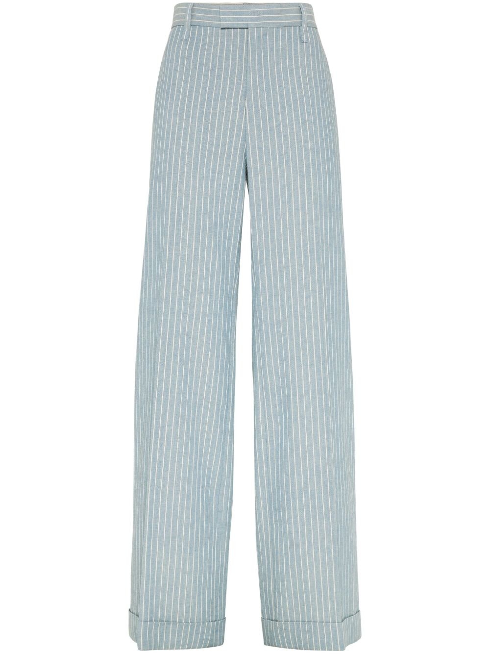 pinstriped trousers Highlights - Light blue - Concealed front button, hook and zip fastening - Belt loops - Two side slash pockets - Two rear welt pockets Made in Italy Composition Eco Linen 50%, Cotton 35%, Fabric 15% Washing instructions Specialist Cleaning