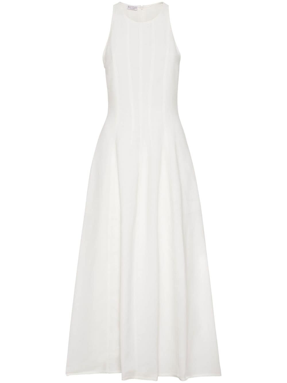pleated sleeveless maxi dress Highlights - Milk white - Pleat detailing - Stripe detailing - Crew neck - Concealed rear zip fastening - Sleeveless - Straight hem Made in Italy Composition Viscose 73%, Linen/Flax 27% Washing instructions Read Manufacturer Guidelines