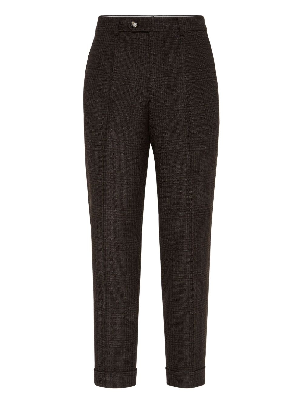 pleated wool-cashmere blend trousers Highlights - Brown - Wool-cashmere blend - Pleated front - Checked pattern - Cuffed hems - Button fastening Made in Italy Composition Wool 95%, Cashmere 3%, Silk 2% Washing instructions Specialist Cleaning