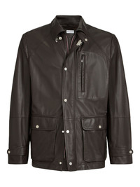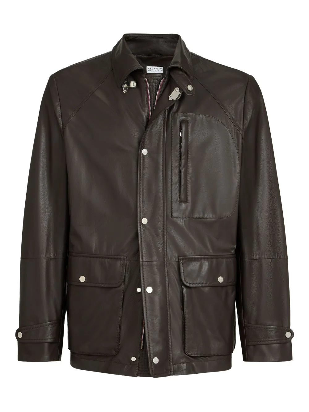 pocket calf leather jacket Highlights - Chocolate - Calf leather - Button fastening - Chest zip pocket - Front flap pockets Made in Italy Composition Calf Leather 100% Washing instructions Specialist Cleaning
