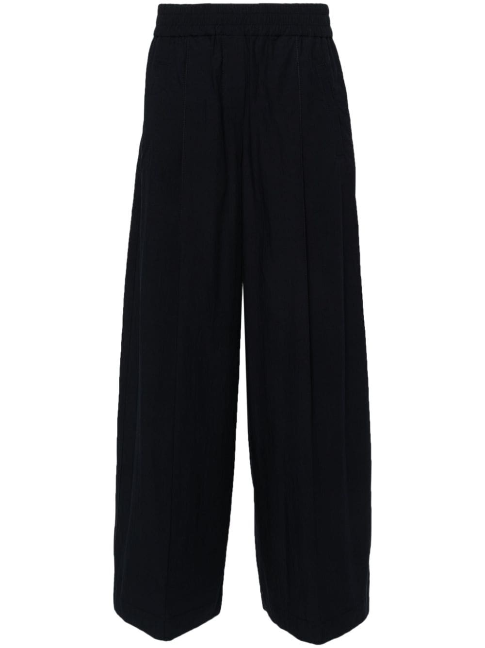 poplin wide trousers Highlights - Navy blue - Cotton - Poplin texture - Two side welt pockets - Pleat detailing - Raised seam detail - Two rear welt pockets - Internal logo tag - Wide leg - Elasticated waistband Made in Italy Composition Outer: Cotton 100% Lining: Polyester 36%, Acetate 32%, Cupro 32% SIZE & FIT Model measurements Height 5 ft 11 in(1.8 m) Bust/Chest 33.07 in(84 cm) Hips 37.4 in(95 cm) Waist 25.19 in(64 cm) FittingInformation Designed with a wide-leg cut, these trousers allow for a close fit at the waist and offer a loose and roomy fit over the leg The elasticated waist allows for a comfortable fit Made from a lightweight non-stretch fabric This piece fits true to size – take your usual size