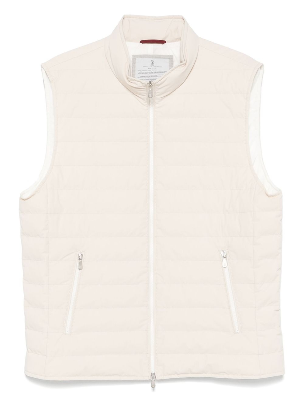 quilted gilet Highlights - Light beige - Front two-way zip fastening - Two side zip-fastening pockets - High neck - Sleeveless Made in Italy Composition Lining: Nylon 100%, Polyamide 100%, Goose Down 90%, Goose Feather 10% Outer: Polyamide 87%, Elastane 13% SIZE & FIT Model measurements Height 6 ft 2 in(1.88 m) Bust/Chest 36.61 in(93 cm) Hips 35.82 in(91 cm) Waist 27.95 in(71 cm) FittingInformation Designed for a relaxed fit, this piece allows for comfort and movement when worn Made from a padded non-stretch fabric, giving it no natural elasticity Washing instructions Dry Clean Only