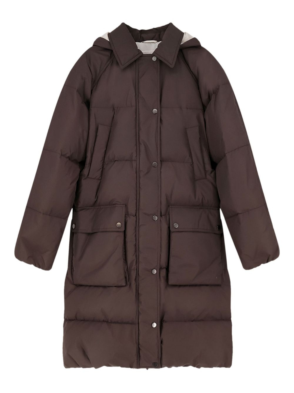 removable hood drawstring jacket Highlights - Dark brown - Removable hood - Front pockets - Flap - Snap buttons - Adjustable drawstring hem Made in Italy Composition Outer: Polyester 55%, Cotton 45% Lining: Down 90%, Feather 10% Washing instructions Read Manufacturer Guidelines