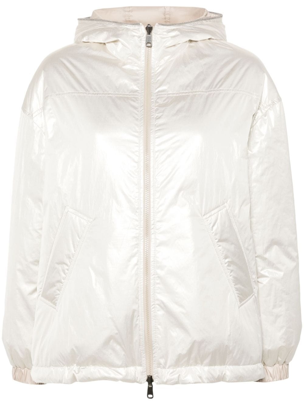 reversible metallic padded jacket Highlights - Beige - Metallic sheen - Reversible - Padded design - Goose down - Classic hood - Signature monili chain detail - Long sleeves - Elasticated cuffs - Two side welt pockets - Straight hem - Front two-way zip fastening Made in Italy Composition Lining: Polyester 100%, Polyamide 100%, Goose Down 100% Outer: Polyamide 100%, Eco Brass 100%, Polyester 75%, Metallic Fibre 25% SIZE & FIT Model measurements Height 5 ft 10 in(1.77 m) Bust/Chest 32.28 in(82 cm) Hips 35.03 in(89 cm) Waist 25.19 in(64 cm) FittingInformation Designed to be unstructured, offering a loose fit throughout The internal drawstring at the hem allows for fitted preferences Made from a padded non-stretch fabric, giving it no natural elasticity This piece fits true to size – take your usual size