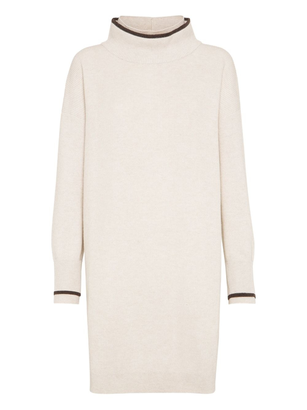 ribbed high-neck dress Highlights - Cool beige - Ribbed knit - High neck - Long sleeves - Dark brown trim - Straight hem Made in Italy Composition Virgin Wool 60%, Cashmere 30%, Silk 10% Washing instructions Read Manufacturer Guidelines