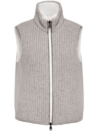 ribbed-knit padded gilet grey cashmere ribbed knit padded design front zip fastening sleeveless Made in Italy Composition Outer: Cashmere 100%, Nylon 100% Lining: Eco Brass 100%, Polyester 55%, Cotton 45% SIZE & FIT Model measurements Height 5 ft 9 in(1.75 m) Bust/Chest 32.67 in(83 cm) Hips 36.22 in(92 cm) Waist 24.8 in(63 cm) FittingInformation This piece fits true to size. We recommend you get your regular size Cut for a loose fit Made with a mid-weight fabric Washing instructions Dry Clean Only