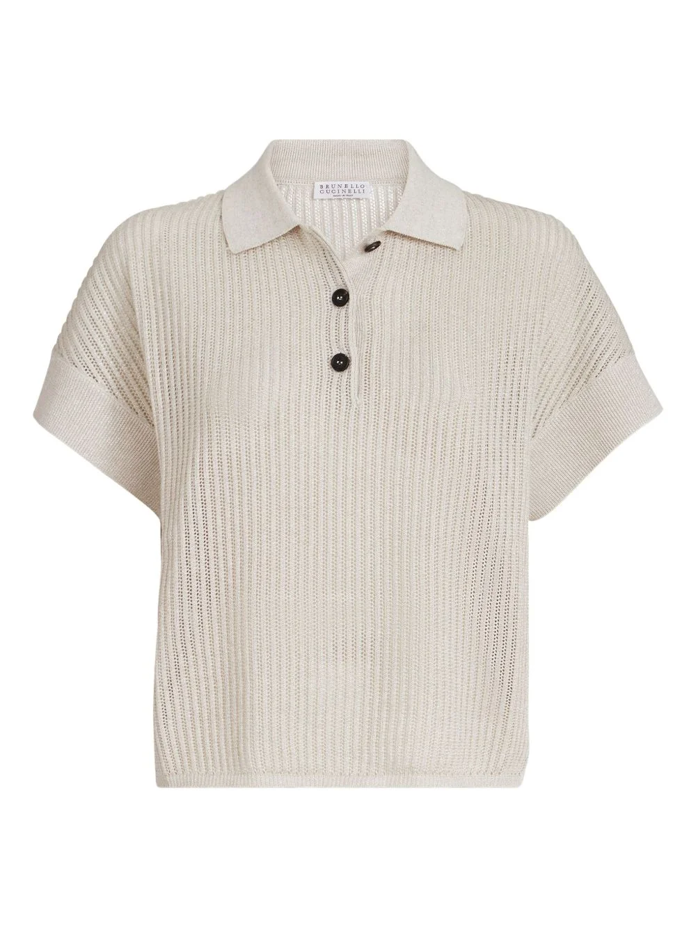ribbed polo top Highlights - Oat - Ribbed knit - Button fastening - Polo collar - Short sleeves Made in Italy Composition Cotton 79%, Viscose 16% Washing instructions Hand Wash