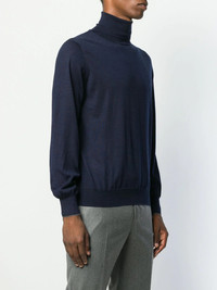 roll neck sweater Navy wool-cashmere blend roll neck sweater from Brunello Cucinelli featuring a fine knit, long sleeves, a relaxed fit and a ribbed hem and cuffs. Made in Italy Composition Wool 90%, Cashmere 10% SIZE & FIT Model measurements Height 6 ft 2 in(1.89 m) Bust/Chest 36.22 in(92 cm) Hips 35.82 in(91 cm) Waist 28.74 in(73 cm) FittingInformation This piece fits true to size. We recommend you get your regular size Cut for a relaxed fit Made with a mid-weight fabric Washing instructions Hand Wash