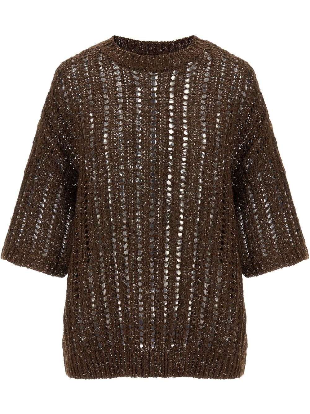 Rustic Dazzling Net jersey Highlights - Brown - Crew neck - Short sleeves - Straight hem Made in Italy Composition Silk 36%, Linen/Flax 34%, Polyamide 17%, Polyester 13%