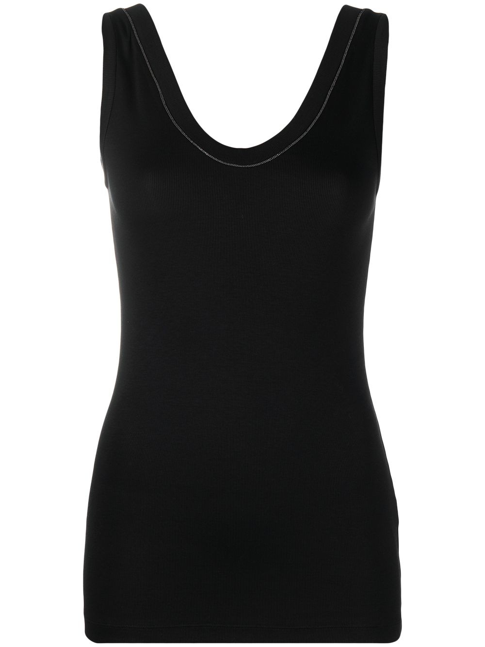 scoop neck sleeveless top midnight blue stretch cotton scoop neck scoop back sleeveless stretch design metallic threading Made in Italy Composition Eco Brass 100%, Cotton 94%, Spandex/Elastane 6% SIZE & FIT Model measurements Height 5 ft 10 in(1.78 m) Bust/Chest 31.88 in(81 cm) Hips 35.82 in(91 cm) Waist 24.4 in(62 cm) FittingInformation This piece fits true to size. We recommend you get your regular size Cut for a slim fit Made with a mid-weight stretch fabric Washing instructions Hand Wash