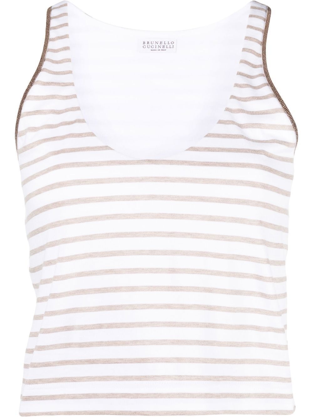 scoop-neck striped vest top cloud white cotton blend horizontal stripe print jersey knit beaded trim detail scoop neck sleeveless straight hem Made in Italy Composition Cotton 100%, Eco Brass 100% SIZE & FIT Model measurements Height 5 ft 11 in(1.8 m) Bust/Chest 31.88 in(81 cm) Hips 35.03 in(89 cm) Waist 24.01 in(61 cm) FittingInformation This piece fits true to size. We recommend you get your regular size Cut for a slim fit Made with a mid-weight fabric Washing instructions Hand Wash