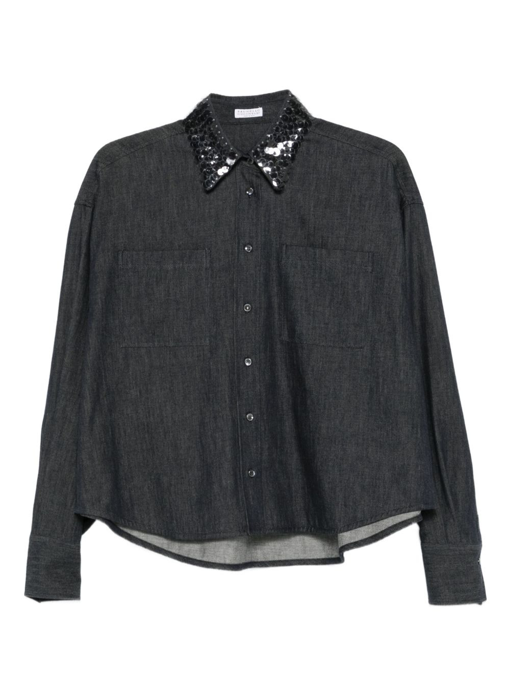 sequin-collar shirt Highlights - Dark blue - Sequin embellishment - Chest pockets - Button fastening - Long sleeves - Buttoned cuffs Made in Italy Composition glass 100%, Polyester 100%, Cotton 100% SIZE & FIT Model measurements Height 5 ft 11 in(1.8 m) Bust/Chest 31.49 in(80 cm) Hips 36.61 in(93 cm) Waist 24.4 in(62 cm) Washing instructions Read Manufacturer Guidelines