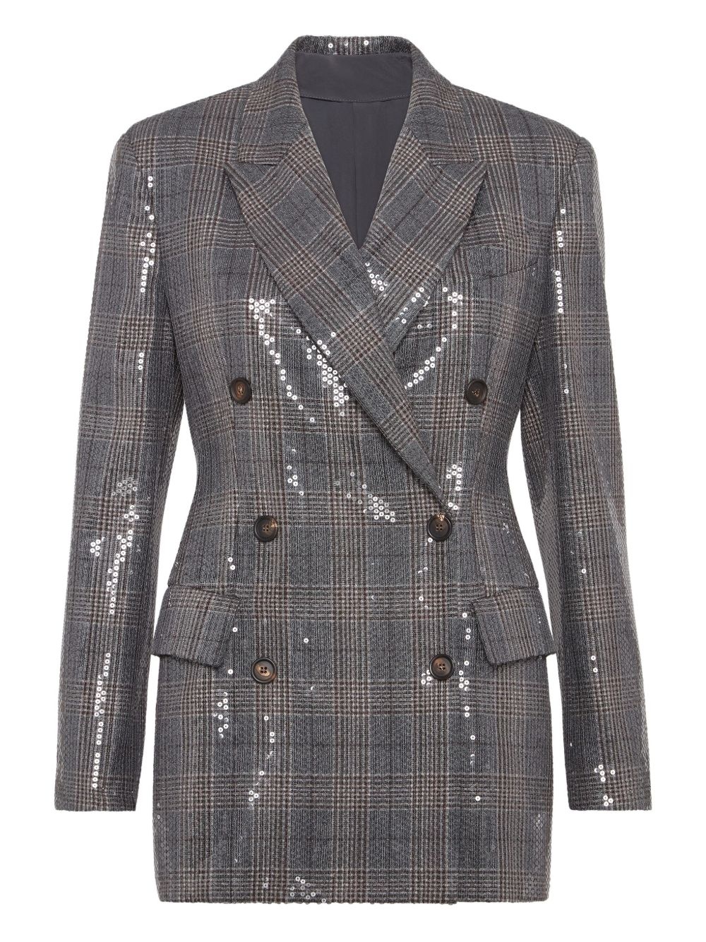 sequin-embellished check-pattern blazer Highlights - Charcoal grey - Check pattern - Sequin embellishment - Double-breasted fastening - Peak lapels - Flap pockets Made in Italy Composition Lining: Silk 100% Outer: Sequin 100%, Virgin Wool 100% Washing instructions Read Manufacturer Guidelines