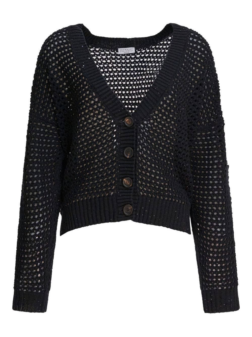 sequin-embellished open-knit cardigan Highlights - Black - Sequin embellishment - Open knit - V-neck - Button fastening - Long sleeves Made in Italy Composition Cotton 96%, Polyester 4% Washing instructions Read Manufacturer Guidelines