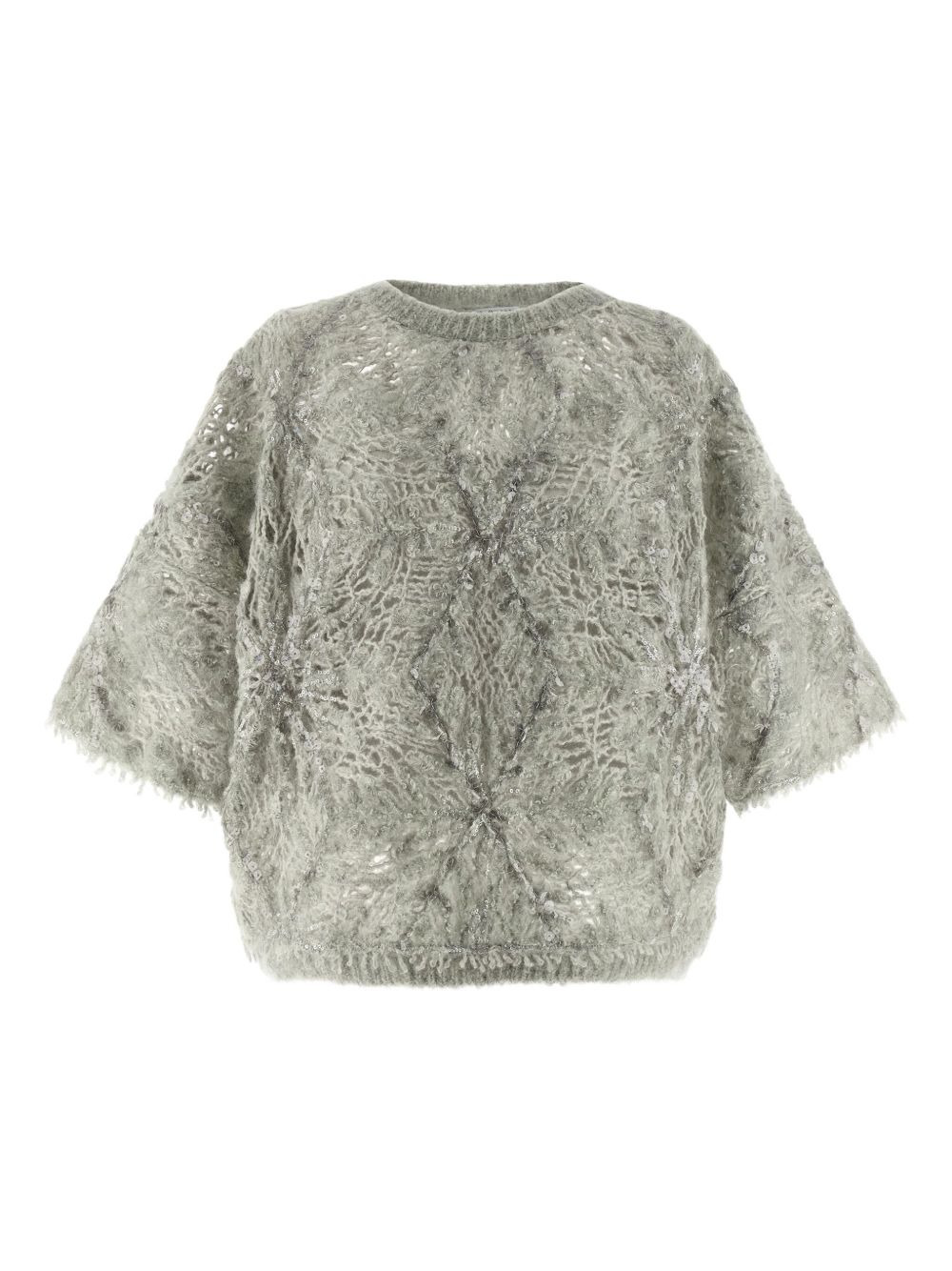 sequin knitted sweater Highlights - Grey - Wide weave knit - Sequin embellishment - Crewneck - Short sleeves Made in Italy Composition Mohair 62%, Wool 32%, Polyamide 6% Washing instructions Read Manufacturer Guidelines