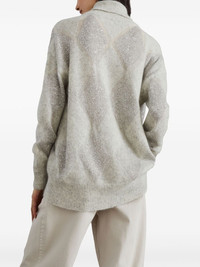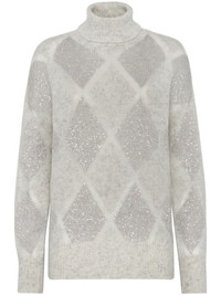 sequined roll-neck jumper Highlights - Light grey - Wool-mohair blend - Knitted construction - Melange effect - Diamond pattern - Sequin embellishment - Ribbed trim - Roll neck - Drop shoulder - Long sleeves - Straight hem Made in Italy Composition Wool 60%, Mohair 40% SIZE & FIT Measurement SLEEVE LENGTH 19.68 in(50 cm) LENGTH 27.55 in(70 cm) WAIST 46.45 in(118 cm)