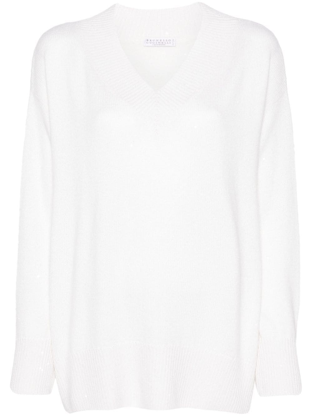 sequined V-neck jumper Highlights - White - Cashmere-silk blend - Knitted construction - Sequin detailing - Ribbed trim - V-neck - Drop shoulder - Long sleeves - Straight hem Made in Italy Composition Polyamide 100%, Cashmere 80%, Silk 20% SIZE & FIT Model measurements Height 5 ft 11 in(1.8 m) Bust/Chest 32.67 in(83 cm) Hips 36.22 in(92 cm) Waist 25.19 in(64 cm) FittingInformation Designed to be unstructured, offering a loose fit throughout The ribbed hem offers a close, comfortable fit Made with a midweight knit, this piece offers some stretch Washing instructions Hand Wash