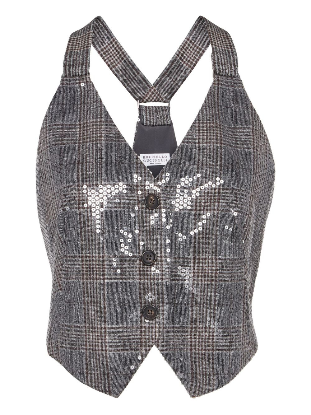 sequinned checked waistcoat Highlights - Grey - Check pattern - Button fastening - Sequin embellishment Made in Italy Composition Virgin Wool 100% Washing instructions Read Manufacturer Guidelines