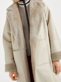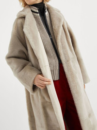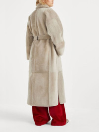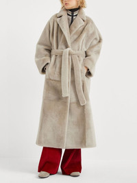 shearling coat Highlights - Almond beige - Shearling - Brushed effect - Front tie fastening - Notched lapels - Drop shoulder - Long sleeves - Belted waist - Slip pockets to the sides - Straight hem - Long length Made in Italy Composition Sheep Skin/Shearling 100%, Sheepskin 100% SIZE & FIT Measurement SLEEVE LENGTH 21.65 in(55 cm) LENGTH 52.75 in(134 cm) WAIST 47.24 in(120 cm)